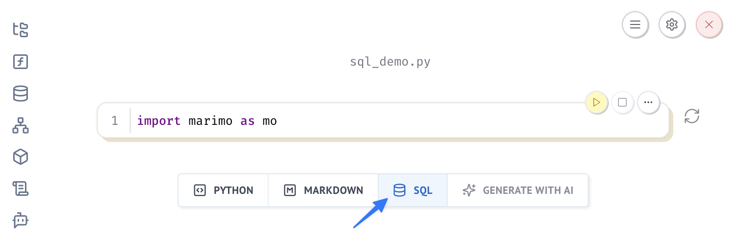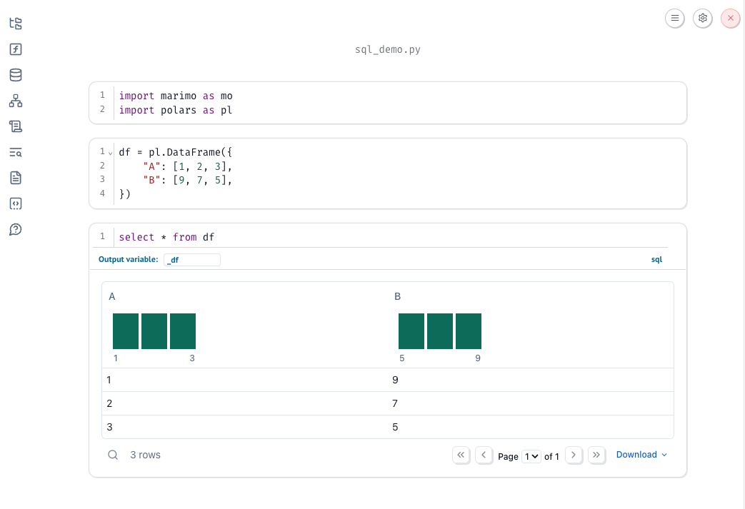 marimo lets you mix and match Python and SQL: Use SQL to query Python dataframes (or databases like SQLite and Postgres), and get the query result back as a Python dataframe.